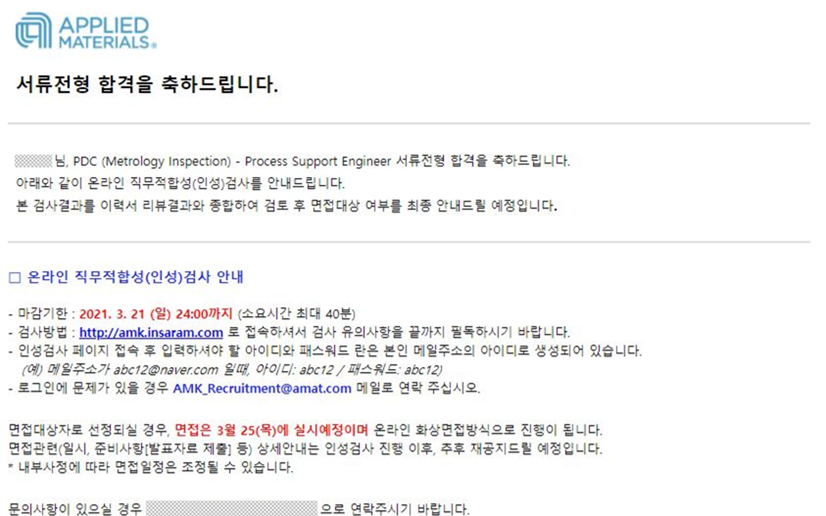 우선, Applied Materials의 채용전형은 총 2회의 면접과 온라인 인적성, 그리고 영어시험으로 이루어져요. 그런데 저는 코로나 시국이라서 모든 전형을 온라인으로 진행했어요.