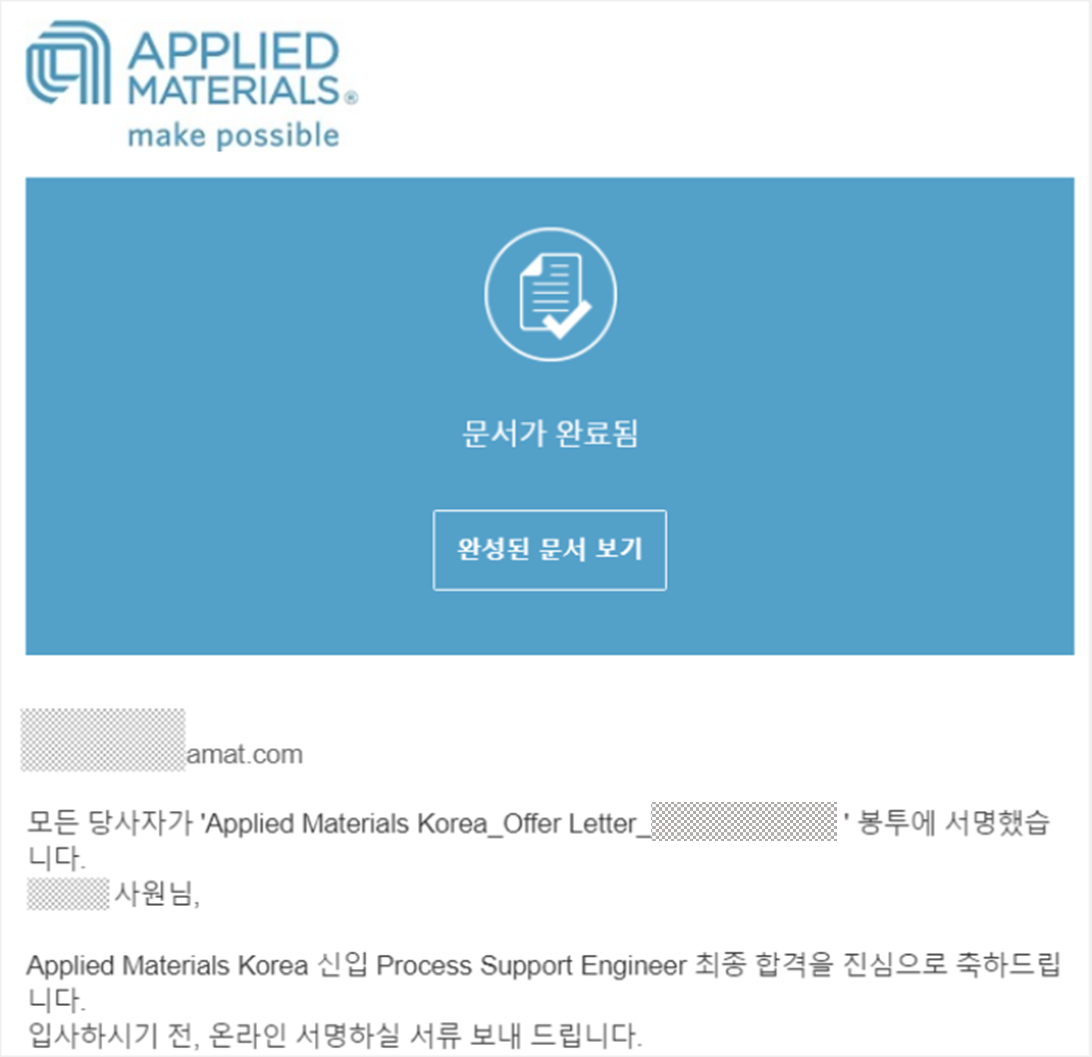 건강검진을 받고 3일 뒤, 마침내 인사팀에서 Offer Letter를 보내주었습니다. 서명을 마친 뒤 마침내 최종적으로 AmK 사원이 될 수 있었고, 4월 29일에 첫 출근을 하였습니다. 3전 4기의 도전 끝에 힘들게 이룬 성과인 만큼, 후회 없는 회사생활을 해 나가야겠다는 각오로 불타는 순간이었습니다. ㅎㅎㅎ