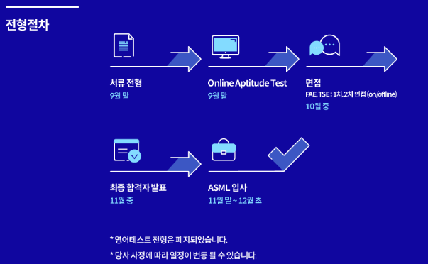 ASML은 다른 외국계 기업과는 다르게 이제 영어테스트를 진행하지 않네요. 서류전형 > 온라왼 인적성 > 1, 2차 면접 순으로 채용이 진행되고 있습니다